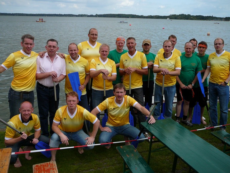 Trotz eines Wochenendprogramms, welches die volle körperliche Leistungsfähigkeit der Newcomer am Sonntagnachmittag sicherlich beeinträchtigte - eine Brauereibesichtigung im Artland, eine Partie Fußballgolf in Wiefelstede und ein Bowlingabend in Oldenburg - gelang es dem Team bei bestem Sonntagswetter, die zahlreich erschienen Zuschauer in Staunen zu versetzen und zu Fans der "gelben Teufel" zu machen. So fuhren die Löwen nach einer kurzen Trainingsfahrt bei Ihrem zweiten Auftritt im Drachenboot eine Wertungszeit ins Ziel, die nur zwei Sekunden hinter dem nächstplatzierten Boot lag. Eine Andeutung dessen, wozu die Newcomer aus dem Osnabrücker Land bei gleichem Trainingsaufwand wie ihre Gegner in der Lage gewesen wären.