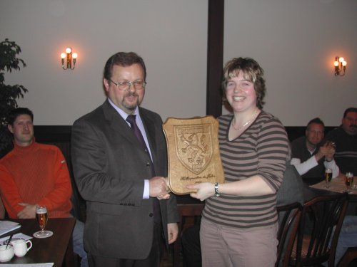 Als Hallensportlerin des Jahres gratuliert er Wera Hengelage und überreicht als Erinnerung einen Holzstich. Franz Frohne als Sportler des Jahres Fußball kann leider nicht an der Versammlung teilnehmen.