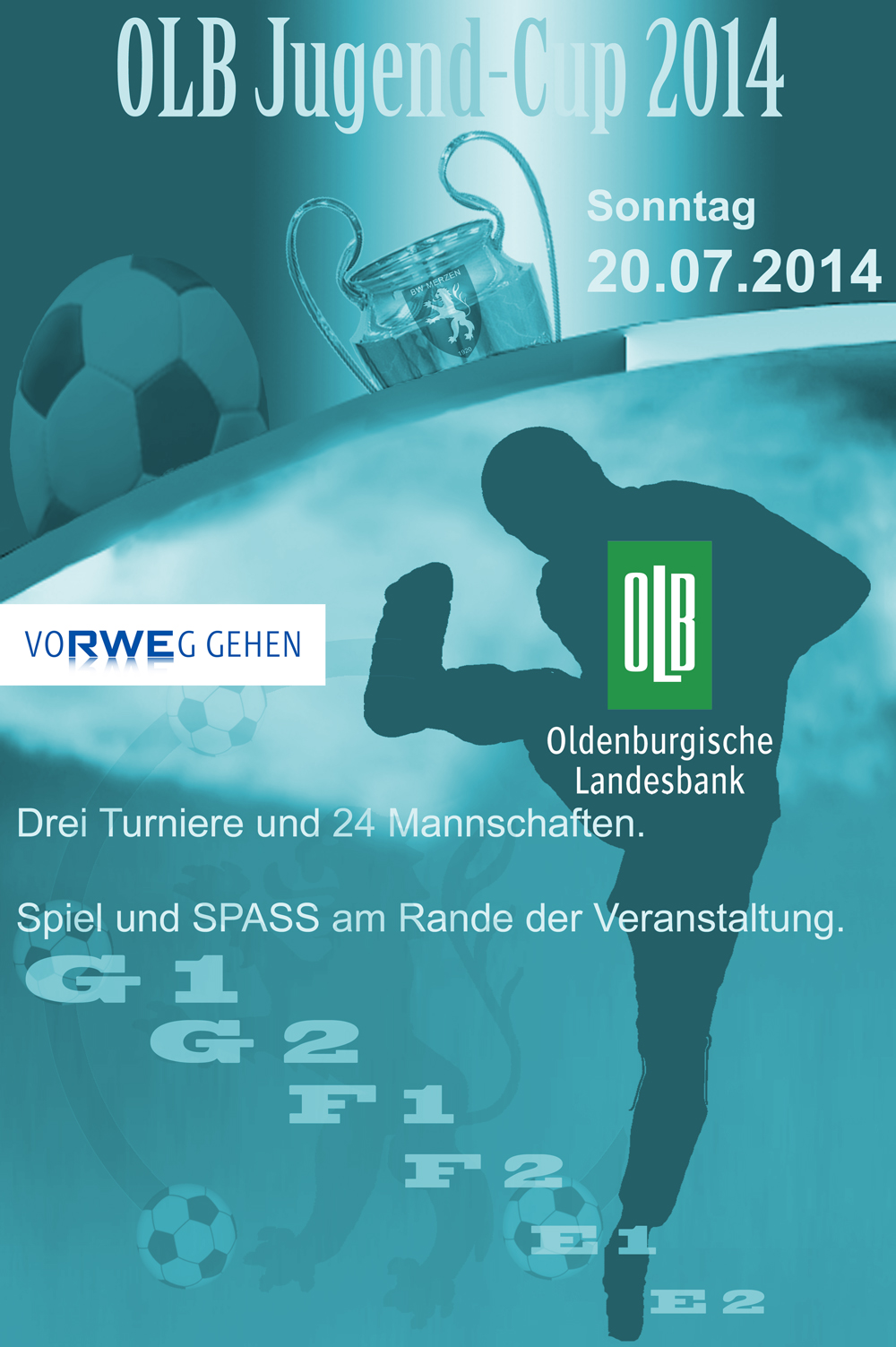 16.07.2014 16:00 Uhr | 2796 x gelesenAm kommenden Sonntag, direkt nach dem Samtgemeindeturnier, veranstalten wir, die Jugendabteilung, wieder unseren jährlichen Jugend Cup mit großer Unterstützung der Oldenburgischen Landesbank und der RWE. 24 Jugendteams,von 6 bis 11 Jahren, werden auf der Löwenkampfbahn begrüßt und kämpfen in drei Turnieren um den begehrten Cup. Um 9 Uhr beginnen die Minikicker, das F-Jugendturnier startet gegen Mittag und am Nachmittag können die großen E-Jugendspieler ihr Talent zeigen. Am Rande der Veranstaltung gibt es eine Hüpfburg, Torwandschießen und in diesem Jahr neu - den Geschwindigkeitsmesser. Wer haut die Pille am schnellsten ins Tor? Selbstverständlich ist für das leibliche Wohl gesorgt. Die Jungtalente würden sich über eine große Zuschauerzahl freuen.